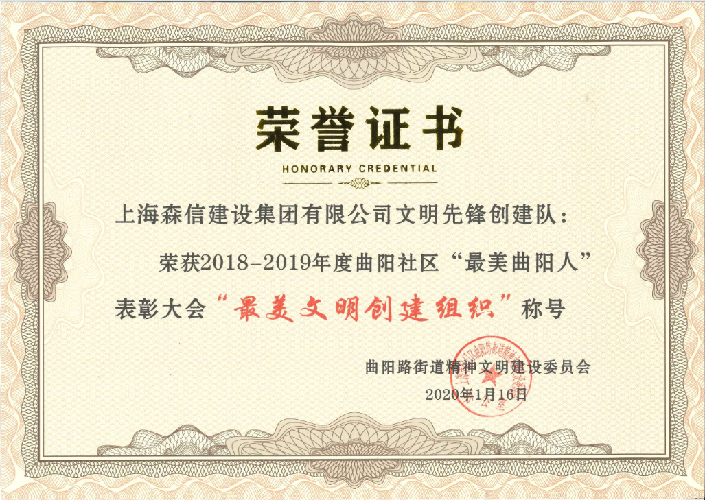 2020年1月16日下午,2018—2019年度曲陽社區(qū)“最美曲陽人”表彰大會暨迎新春聯(lián)歡會在 上海外國語大學(xué)逸夫會堂舉行,我司申報的“文明先鋒創(chuàng)建隊”榮獲 曲陽社區(qū)“最美文明創(chuàng)建組織”稱號。
